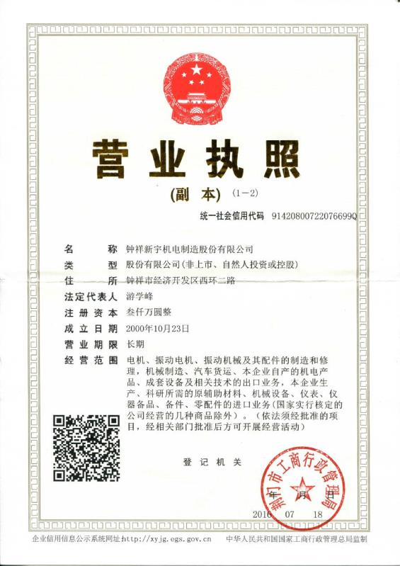 钟祥新宇机电制造股份有限公司前身是钟祥电机厂,创建于1968年,于2014年09月24日由“钟祥新宇机电制造有限公司”变更名为“钟祥新宇机电制造股份有限公司主要生产各类振动电机、振动机械、输送机械。是中国电器工业协会中小型电机分会理事单位、中国重型机械工业协会洗选设备专业委员会理事单位,是国内大型的振动电机生产厂家。